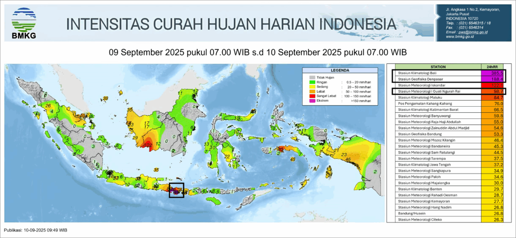 Gambar 1. Curah hujan harian Indonesia pada 09 – 10 September 2025 (Sumber: BMKG)