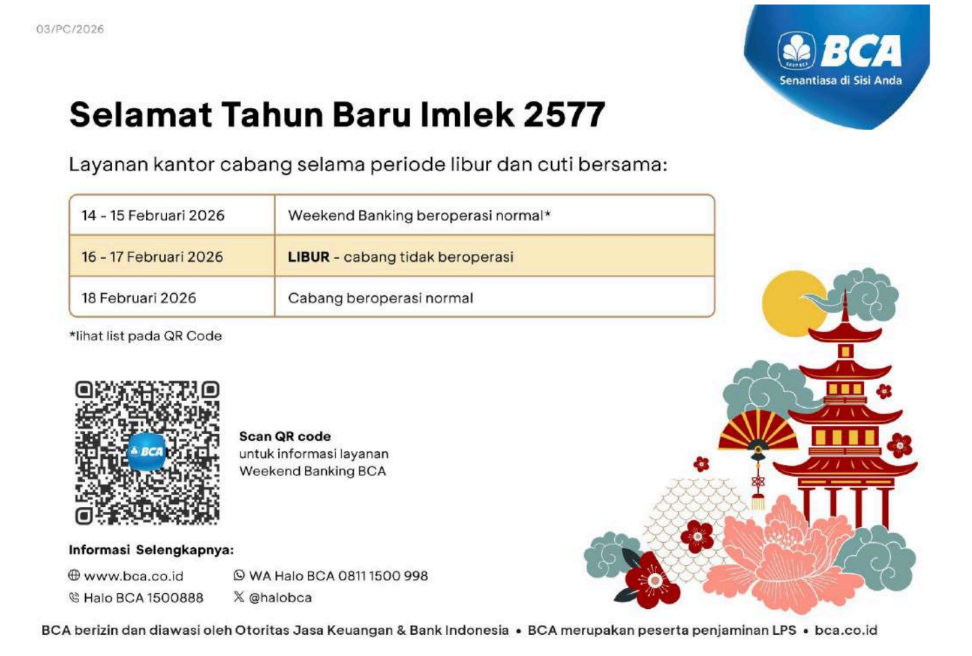 Berikut detail penyesuaian operasional kantor cabang BCA selama libur dan cuti bersama Tahun Baru Imlek 2026: